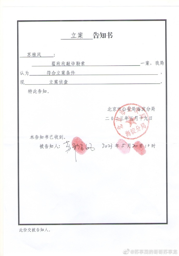 6月9日,苏享茂的哥哥苏享龙微博发文,称“翟欣欣已被逮捕,羁押在看守所”。苏享龙提供的加盖北京公安局海淀分局公章的立案告知书显示,翟欣欣敲诈勒索一案,该局认为符合立案条件,现立案侦查。此前报道据北京市